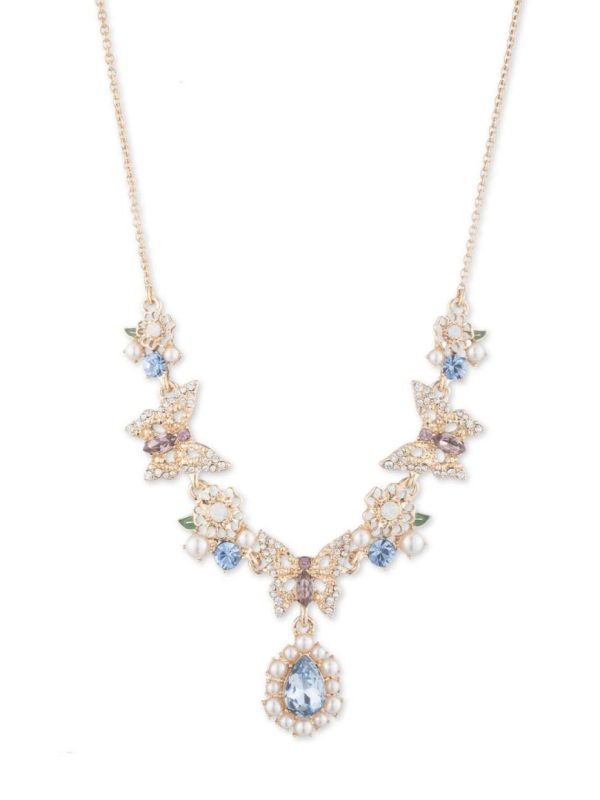 The Butterfly Necklace alternates between dainty floral charms and crystal-embellished butterflies. Sky blue and mauve stones scatter the charms to bring life to the bejeweled garden. The statement gold necklace is featured in a gold tone with gold hardware and measures 16 inches in length with four length options.