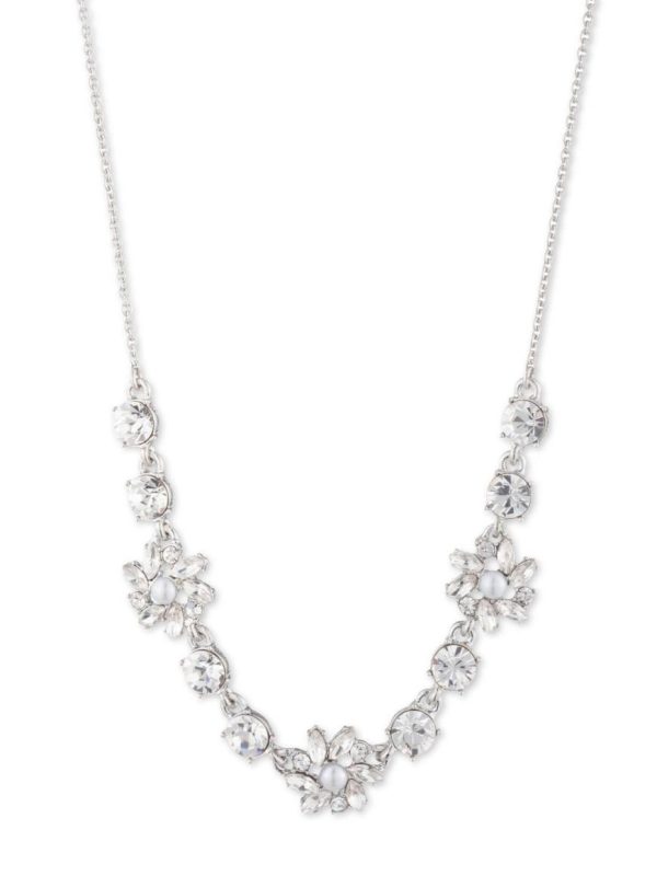 The Crystal Sweet Stone Necklace alternates between geometric crystal flowers and round translucent crystal. The statement silver necklace is featured in a silver tone with silver hardware and measures 16 inches in length with four length options.