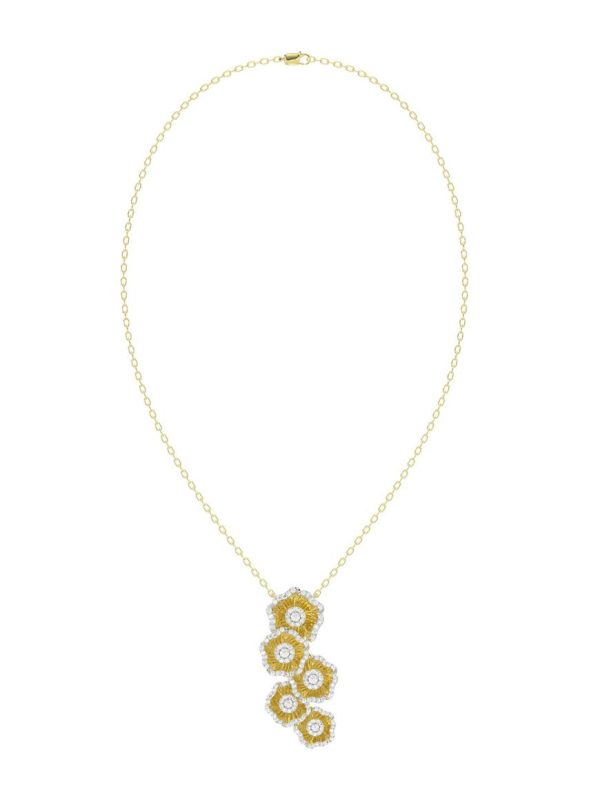 The Halo Flower Yellow Gold Necklace is an 18 karat yellow gold delicate chain with a pendant composed of five staggered gold and natural diamond camellia-inspired flowers.