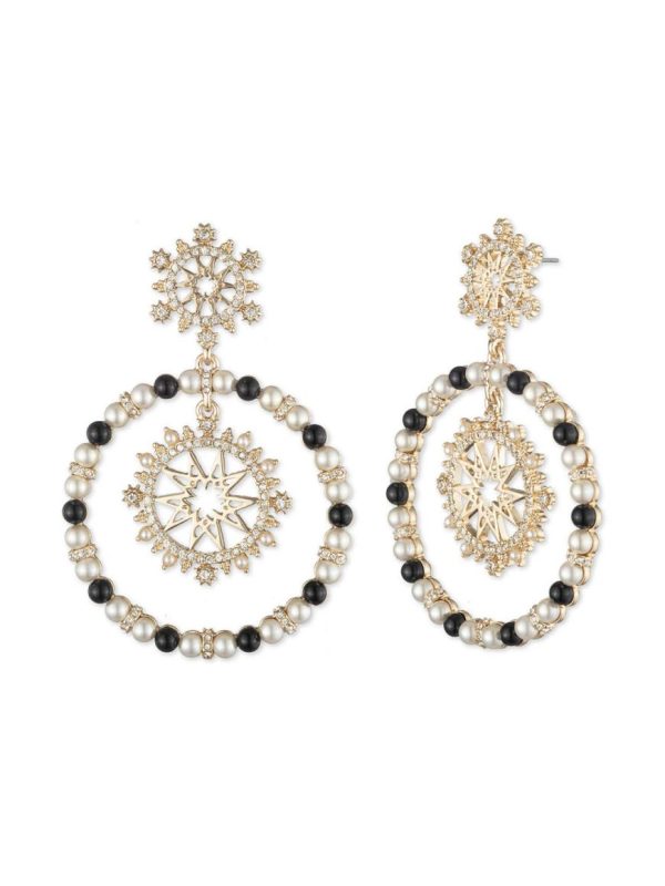 The Black Orbital Pearl Earring is a drop earring featuring alternating black and white faux pearls framing a geometric charm at the center. The statement earrings are gold plated with a gold tone and gold hardware.