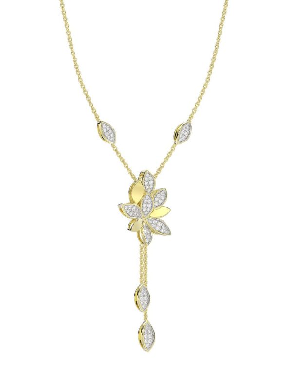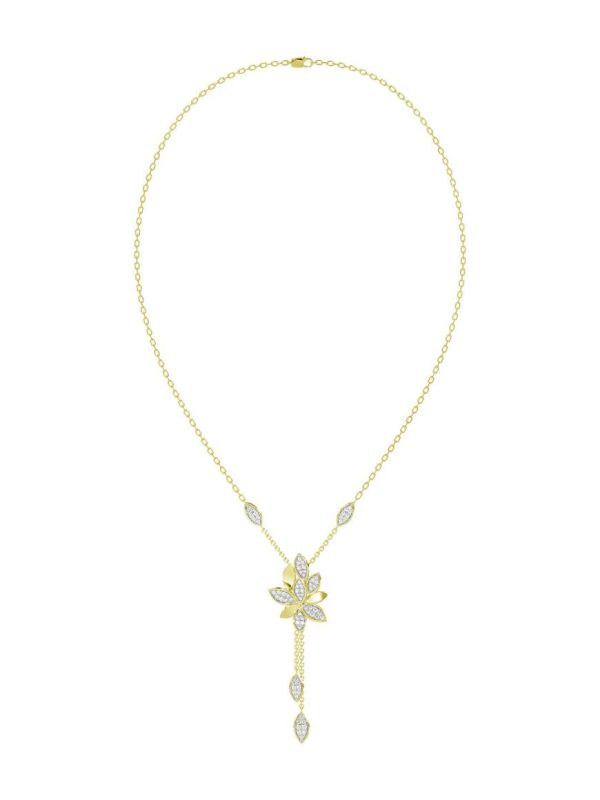 The Wild Flower Yellow Gold Y Necklace is an 18 karat yellow gold chain with a dynamic teardrop-shaped diamond and yellow gold flower at its center. The chain is adorned with almond-shaped natural diamond accents.