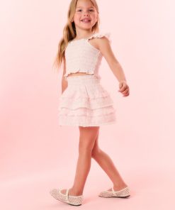 Meet our beloved Billie Skirt in 100% cotton. Below a wide smocked waistband, the skirt falls to two shirred tiers with ruffle details.