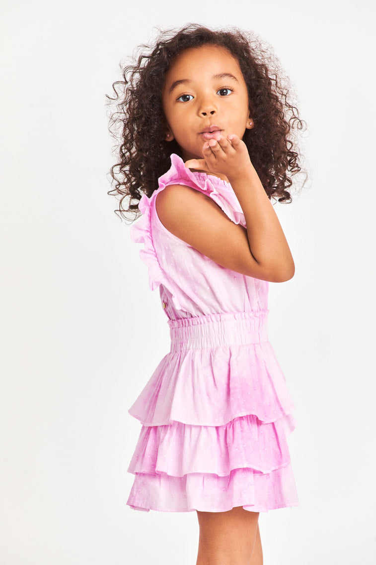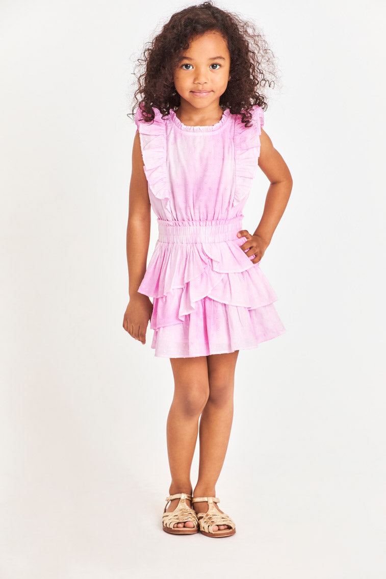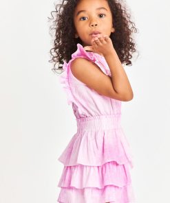 Meet our Decker Dress for girls in 100% cotton with custom lace. This easy frock has a ruffle-trimmed collar, buttons down center front, flutter sleeves, an elastic waist and overlapping asymmetrical ruffles at the skirt.