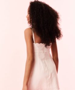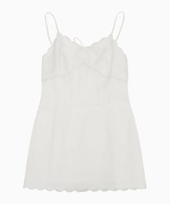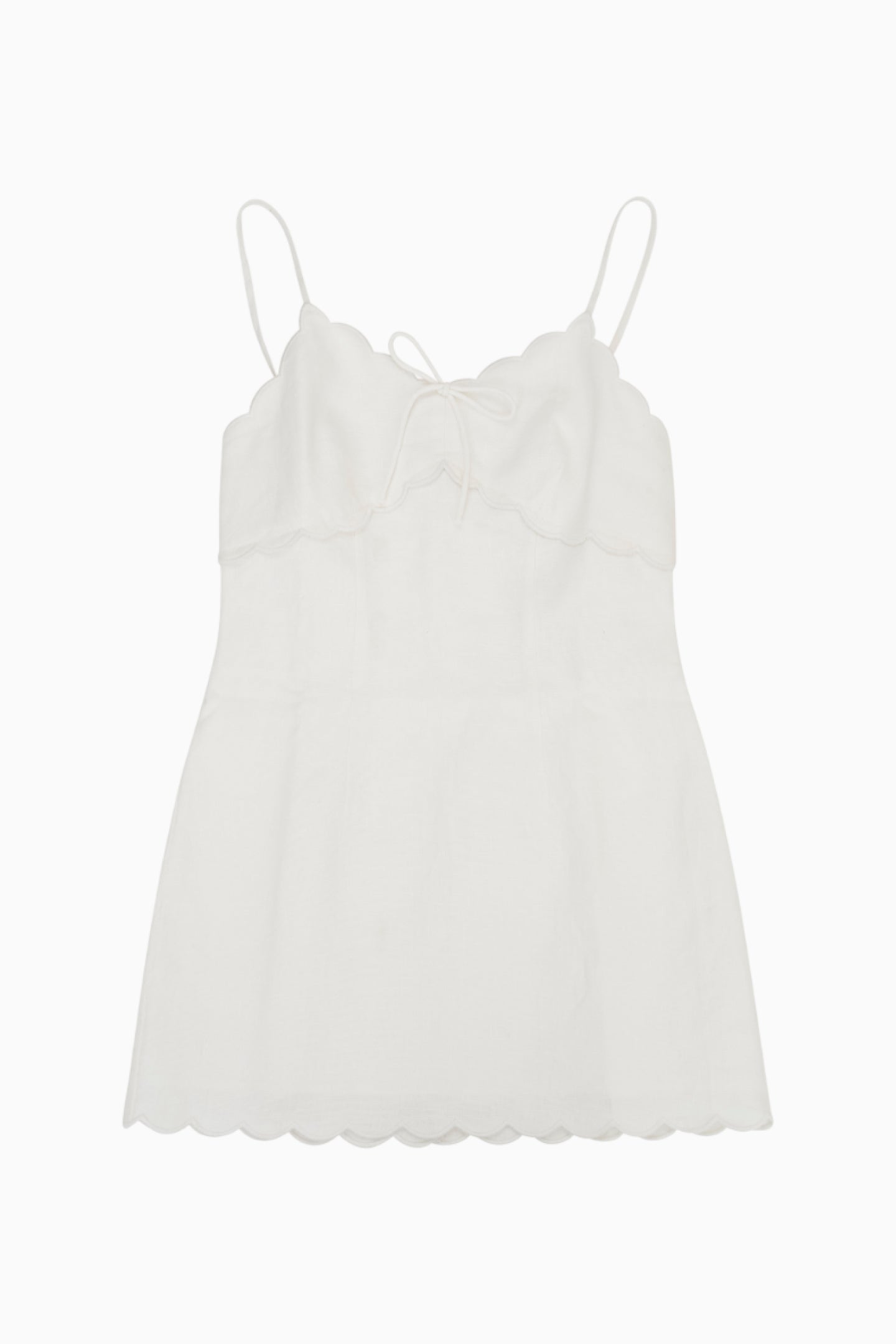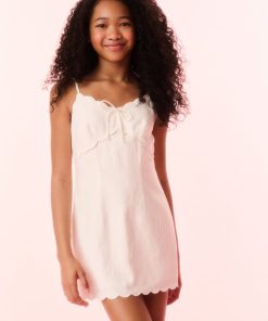 Our minis are sweet in the Sydelia Dress. This charming linen dress features thin spaghetti straps, scallop detailing and a self-tie bow detail at center front.