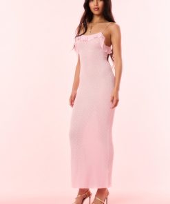 Elevate your wardrobe with the Alivia Dress. This feminine dress makes its arrival in a lightweight stretch yarn with delicate pointelle stitch all over. With a slim-fitting silhouette, the flirty midi begins with thin spaghetti straps above a ruffle-adorned neckline that falls to the body-skimming skirt. The dress is slightly sheer giving it a sexy finish.