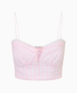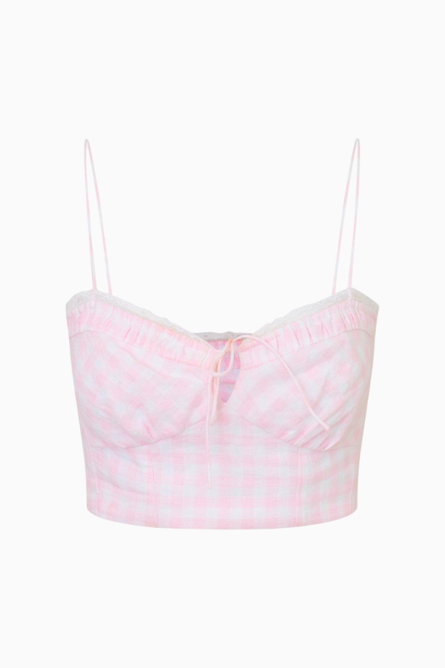 Introducing the Amorana Top. This sweet cropped cami breezes in with a crisp linen fabric featuring a coastal pink gingham print all over. The top features a delicate self-tie detail at the front, thin spaghetti straps, smocking at the back for comfort and ease, and hits at the natural waist. Pair with the Biselle Skirt for the full set.