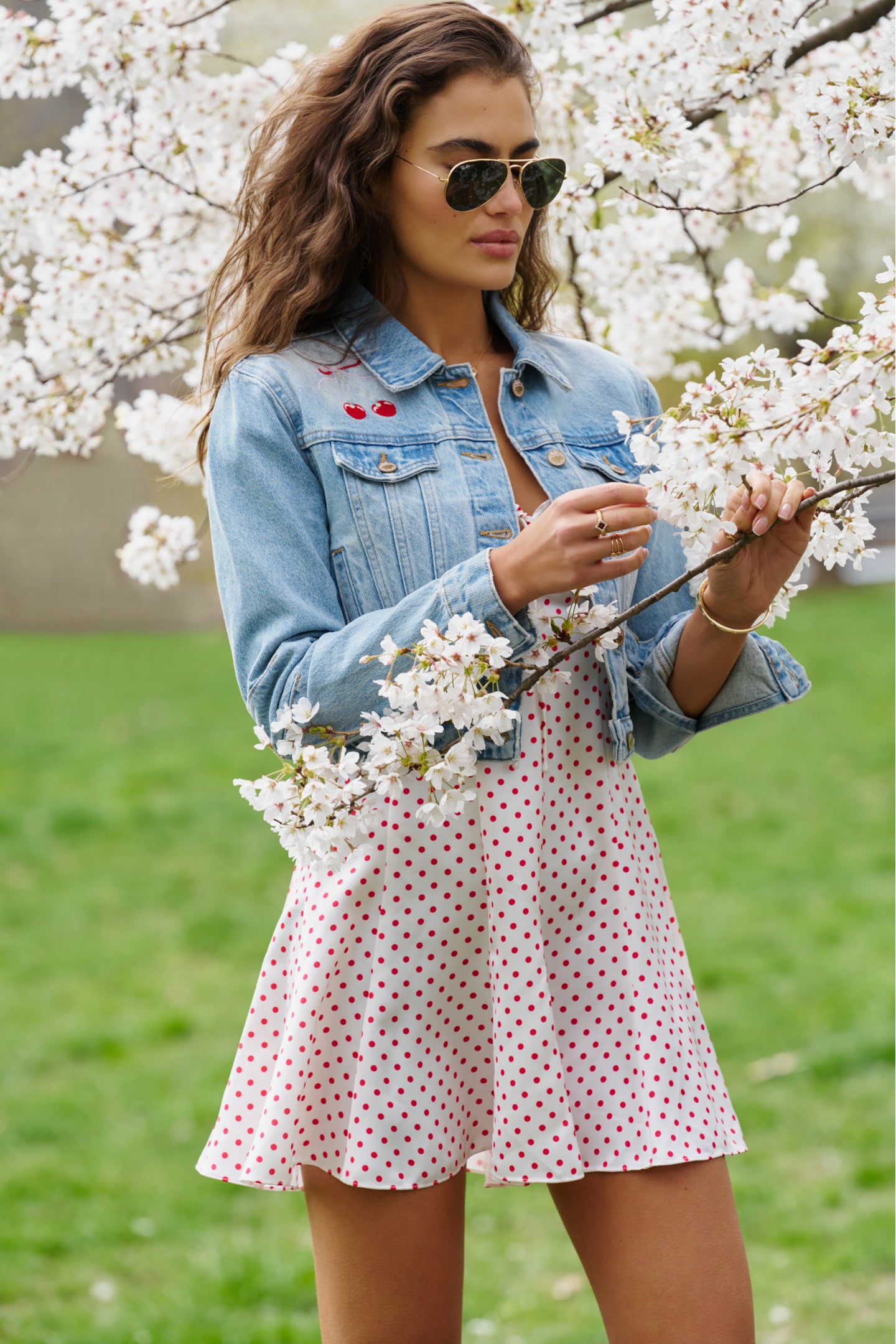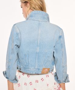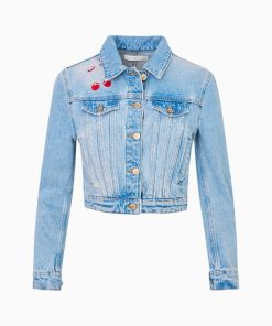 Our Bardot Jacket arrives as part of our America’s Sweetheart Cotton Collection. This flirty denim jacket features a playful larger scale cherry embroidery at the chest. With a cropped, slim fit, this piece has slim sleeves, bustier-inspired seams at the bodice, flat pockets, tabs at the sides at the waist, and hits at around the natural waist.