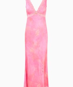 Introducing the Bier Dress. This gorgeous slip dress stuns with a solid charmeuse silk blend fabric with a hand-dyed-like print all over. The midi dress features vintage-inspired laces at the neckline and hem adorned with shell-and-pearl embellishments.