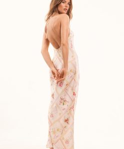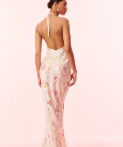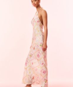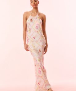 Introducing the Brynthe Dress. Arriving in a silk blend charmeuse fabric, this stunning dress features a beautiful hand-painted print of cherries, lemons, and florals amongst diagonal strips, inspired by postcards from Italy. The midi slip dress has a halter top with delicate self-tie neck ties, and an ever-flowing, body-skimming silhouette.