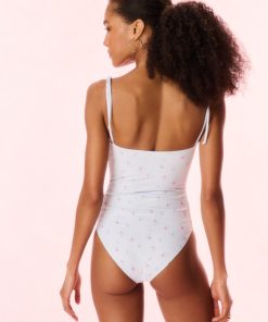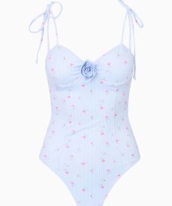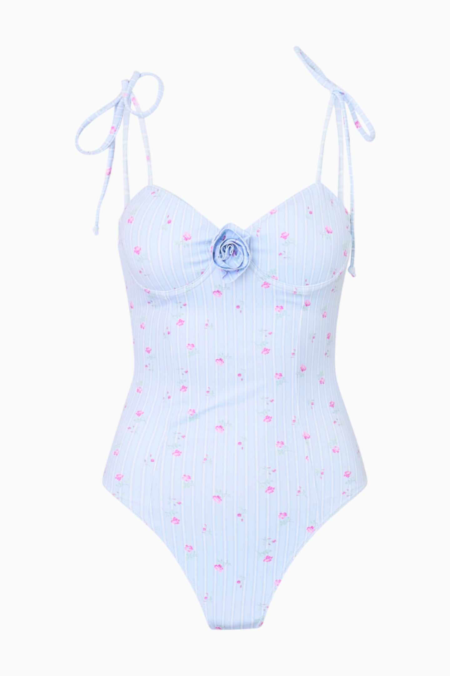 Introducing the Chamomile One Piece. The perfect swimsuit for your next vacay, this pretty one-piece features color blocking details with a dainty floral print all over.