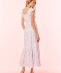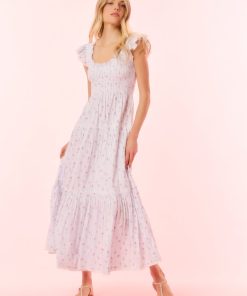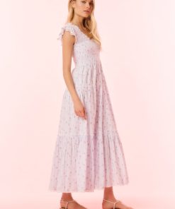 Our Chessie Dress returns with a striped cotton voile fabric featuring a ditsy floral print all over. Featured in a floral-printed, ultra-soft cotton, this airy dress is perfect for a date night or soaking up the sunshine. Ruffle sleeves flutter at the shoulders that merge around the scoop neck. The fitted smocked bodice flounces into a dreamy midi skirt decorated with custom lace insets.