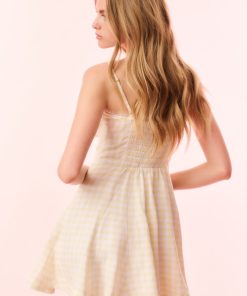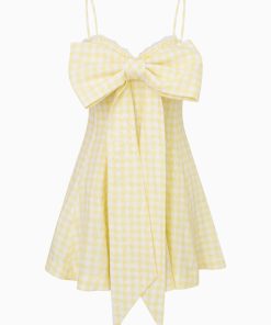 Sunshine ready in the Clarine Dress. The gorgeous mini dress arrives in a crisp linen fabric with a pretty gingham print all over. This piece begins with thin spaghetti straps above a sweetheart neckline that falls to an airy skirt and finishes with an oversized fixed bow. Because everything’s better with a bow.