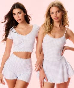 On the go in the Gia Biker Short. These easy active shorts are designed for low and high impact movement with our lightweight, breathable fabric. Arriving in a playful gingham print, the bottoms feature a lace trim for a feminine finish. Pair with the Kudura Top for a full set.