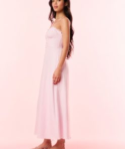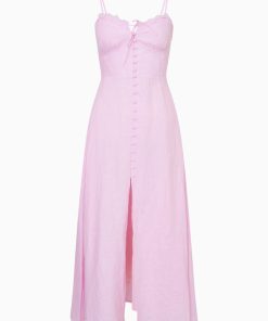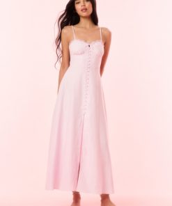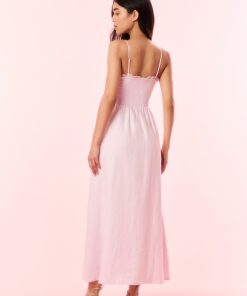 Loving on the Linella Dress. Designed from a crisp linen fabric, this must-have maxi was made for summer. Timeless and classic in all the right ways, this dress features thin spaghetti straps, bustier-inspired cups at the bust with shirring details, a playful keyhole cutout, a center front placket that stops at the hip above a flirty center front slit. The back is smocked for easy wear.