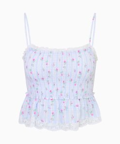 The Marzenia Top returns for the season with a striped cotton voile fabric featuring a ditsy floral print all over. This Victorian-inspired piece features textured stripes, a smocked bodice to the empire waist and a charming flutter peplum adorned with lace trims and delicate tucking. Adjustable spaghetti straps ensure a perfect fit, making it ideal for pairing with skirts or denim for both casual and elegant occasions.