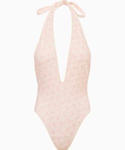 Introducing the Meegan Swimsuit. This flirty one-piece debuts with a pretty new print. The swimsuit has a self-tie detail around the beck, embroidery stitching around the neck and arm holes, coverage at the back, and a sexy, plunging neckline.