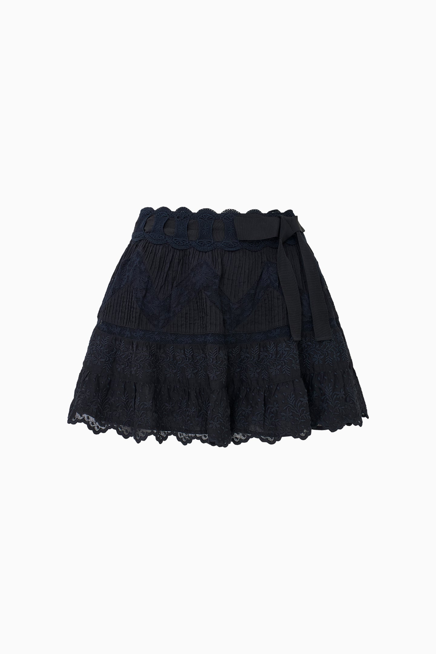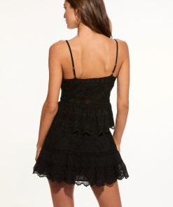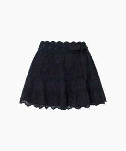 On the way in the Nerina Skirt. This elevated mini is designed with a stretchy, ultra-light cotton voile fabric with zig zag wide vintage-inspired laces with tucking, scallop embroideries, and a delicate threaded ribbon at the waist. The A-line piece includes a zipper for functionality. Pair with the Rowina Top for a full set.