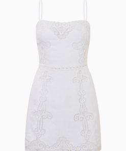 Effortlessly chic in the Olivine Dress. This elated mini dress arrives in a crisp, lightweight linen featuring custom developed battenburg lace at the neck edge and nipped at the waist. The structural mod-shaped mini has spaghetti straps and includes a zipper for functionality.