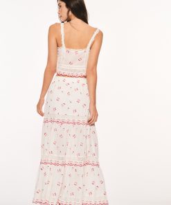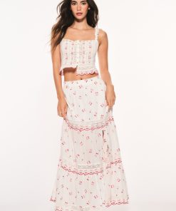 Introducing the Patten Skirt as part of our America’s Sweetheart Cotton Collection. This nostalgic midi stuns with custom developed scalloped trim featuring embroidered dancing cherries all over. With an A-line silhouette, the skirt has smocking at the waist before falling to the multi-tiered skirt. The piece is completed with pockets.
