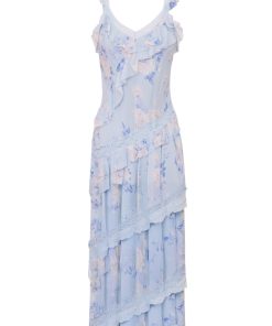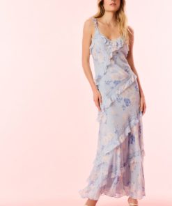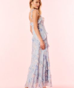 Our best-selling Radiance Dress returns as part of our Fragrance Capsule Collection, this time arriving in our beloved perfume prints. This dreamy maxi is designed with a printed chiffon fabric for the warm weather season. With an airy and breezy silhouette, the dress is stripped with delicate laces all over sourced from vintage textiles. The pieces begin with lace straps that fall to tiny flutter sleeves that fall to an easy skirt with tiny ruffle details all over.