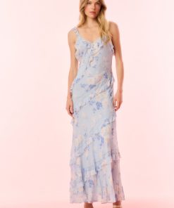 Our best-selling Radiance Dress returns as part of our Fragrance Capsule Collection, this time arriving in our beloved perfume prints. This dreamy maxi is designed with a printed chiffon fabric for the warm weather season. With an airy and breezy silhouette, the dress is stripped with delicate laces all over sourced from vintage textiles. The pieces begin with lace straps that fall to tiny flutter sleeves that fall to an easy skirt with tiny ruffle details all over.