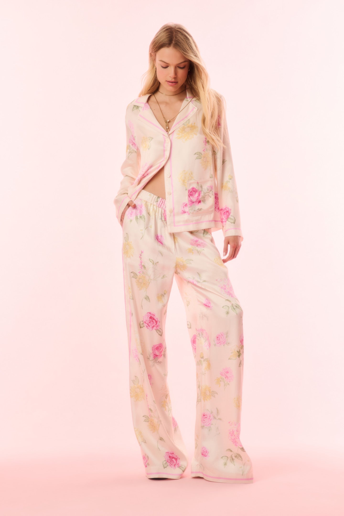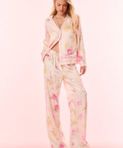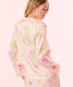 Introducing the Renetta Top. This elevated pajama top features an Italian-inspired print with hand-painted flowers in a romantic arrangement and stripes throughout. The loose top begins with a camp collar, buttons down center front, long sleeves, and pockets at the waist area. Pair with the Helia Pant for a full set.
