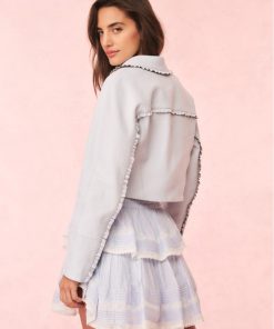 Level up your look with the Rheisa Jacket. This 80s-inspired moto jacket is designed from 100% lamb leather. The piece begins with a biker collar and princess zip up seam around the collar with delicate ruffles to give it our signature feminine touch. The ruffles flow to the back and travel up the back of the sleeves and around the jacket. With a modern look and feel, this piece is finished with two zipper pockets with leather zipper pulls.
