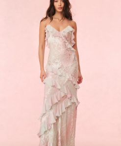 Our best-selling Rialto Dress returns with our beloved burnout viscose drapey fabric for the spring with bright, vibrant colors. This must-have party maxi stuns with overlapping, asymmetrical ruffles at the neckline that continue to descend through the entire skirt. Slightly fitted, this dress features a sexy silhouette.