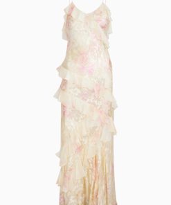 Designed for sunsets and dancing, our best-selling Rialto Dress returns as part of our Heirloom Print Capsule featuring our signature Ibiza Sunset print made-to-match with our Hair & Body Perfume Mists. Designed completely with crinkle burnout chiffon fabric, this must-have maxi stuns with a vibrant design and overlapping, asymmetrical ruffles at the neckline that continue to descend through the entire skirt. Slightly fitted, this dress features a sexy silhouette and includes a side seam zipper for closure.