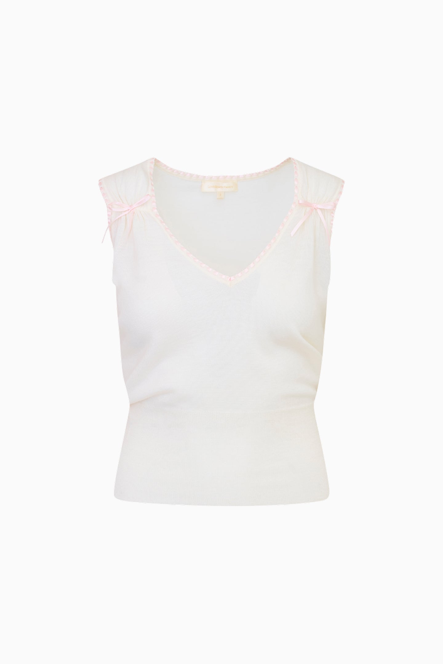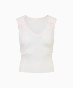 Classic and feminine in the Sephony Tank. This pretty shelf top arrives in 100% Merino wool with high rib trim at the bottom, a jersey tubular trim at the armhole, and the front is gathered with top-applied satin bows.