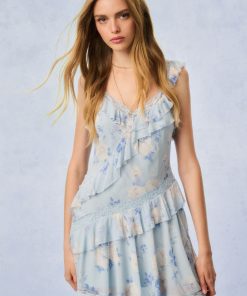 The Serima Dress is back as part of our Fragrance Capsule collection, this time arriving in our best-selling perfume prints.. This gorgeous sun dress is designed with a printed viscose chiffon fabric. The mini begins with tank top straps above a slight v-neckline adorned with tiny ruffles. An asymmetrical ruffle lines the bodice before descending to the airy, pleated skirt.