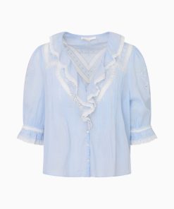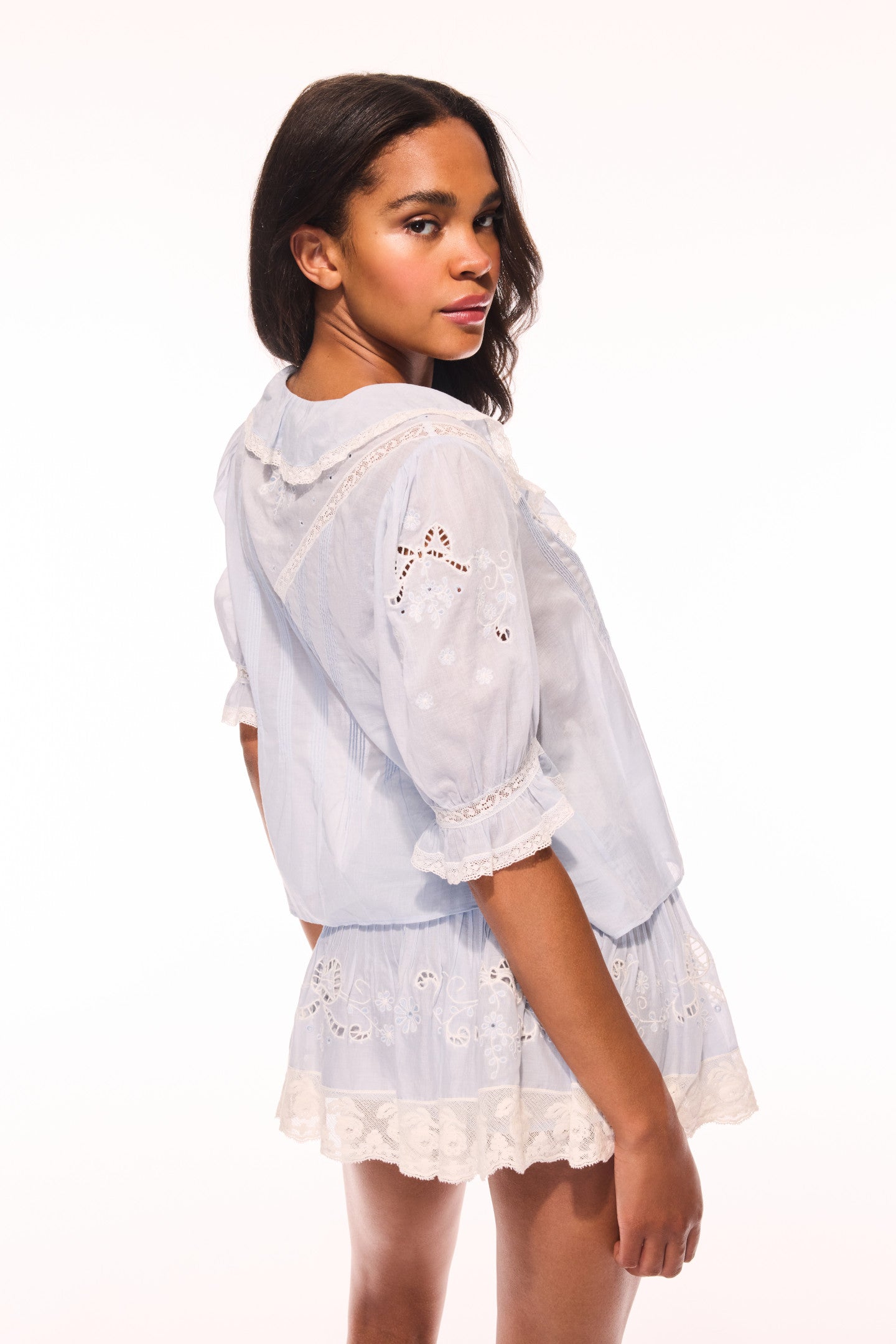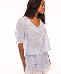 Introducing the Sinora Top. This charming top is designed using an ultra-thin, lightweight cotton voile fabric that’s crisp, but delicate for the high summer season. The short sleeve blouse features dancing embroidered florals all over, puff sleeves, buttons down center front adorned with gorgeous cascading ruffles along the neckline.