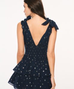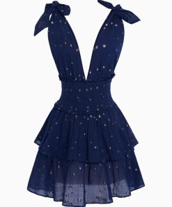 The Soira Dress returns as part of our America’s Sweetheart Cotton Collection. This charming mini is designed with a delicate cotton voile fabric featuring ditsy metallic gold stars embroidered all over. Beginning with a deep v-neck with a self-tie detail the dress descends to a smocked waist. A sweetheart trim lines the neck while eyelet hearts adorn the two-tiered skirt.
