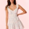 The Soira Dress returns as part of our America’s Sweetheart Cotton Collection. This charming mini is designed with a delicate cotton voile fabric featuring ditsy metallic gold stars embroidered all over. Beginning with a deep v-neck with a self-tie detail the dress descends to a smocked waist. A sweetheart trim lines the neck while eyelet hearts adorn the two-tiered skirt.