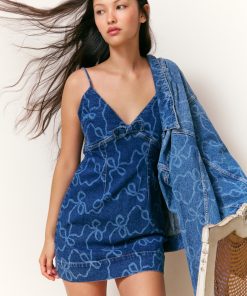 Denim dreams come true with the Solina Dress. This playful mini dress has our signature Luna Rosa Beaux print lasered into the denim for a feminine touch. The body-hugging piece features a wash effect, adjustable spaghetti straps, and a top-applied bow detail at the front. This piece is finished with a zipper.