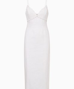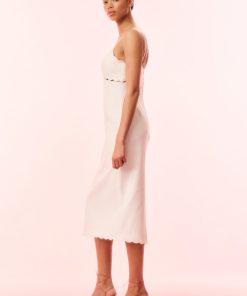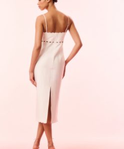Introducing the Sydelle Dress. The midi version of our best-selling Sydow Dress, this sweet piece arrives in a crisp linen fabric for the warm weather season. With a fitted silhouette, the dress stuns with scallop details at the neckline and a cut out detail at the waist. Beginning with thin delicate adjustable spaghetti straps above an open v-neckline, the dress has a center back slit and a zipper for functionality.