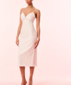 Introducing the Sydelle Dress. The midi version of our best-selling Sydow Dress, this sweet piece arrives in a crisp linen fabric for the warm weather season. With a fitted silhouette, the dress stuns with scallop details at the neckline and a cut out detail at the waist. Beginning with thin delicate adjustable spaghetti straps above an open v-neckline, the dress has a center back slit and a zipper for functionality.