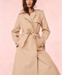 Introducing the Thiel Trench Coat. Our take on a classic, cozy trench coat, this luxe outerwear layer debuts with a midi length and an elevated fabric. Featuring military buttons, the jacket has storm flaps at the chest and back and epaulettes at the shoulder. Giving this piece the LoveShackFancy touch, a giant winding bow applique adorns the hem for a feminine moment. The double-breasted, functional jacket is finished with side seam pockets and a removable belt.