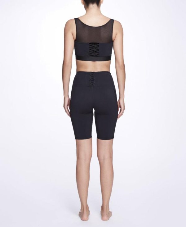 The Coco Bra features a sleeveless design, scoop neckline, sheer panel and a lace-up detail in the back. A lightweight smooth compression fit and super smooth black performance fabric pieced in sheer power mesh is complemented by a wide soft elasticized underband for an excellent fit.