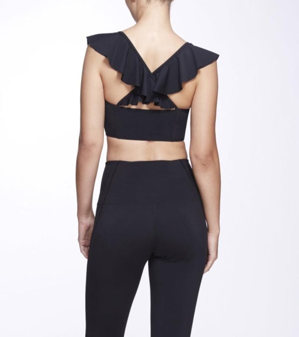 The Crystal Bra features a scoop neckline and ruffled straps that cross in the back. The lightweight and smooth compression fit, ruffle detail sleeves, and the super smooth performance fabric make this perfect for wearing from the gym to brunch!