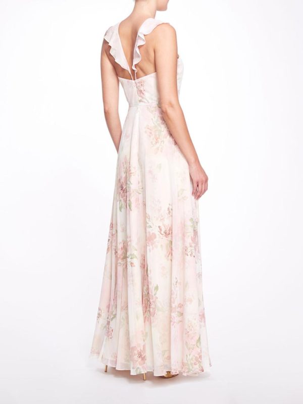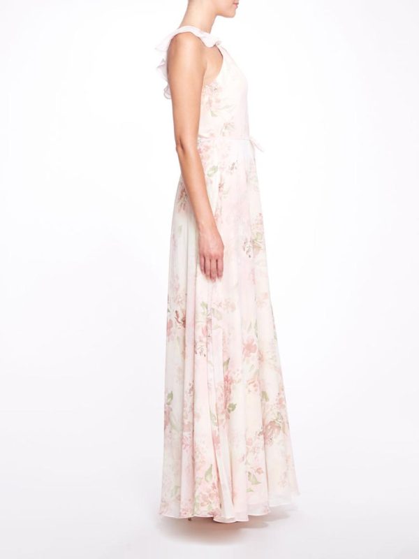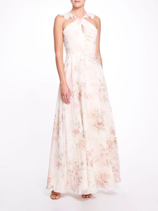 Step out in the effortless Pavia gown in blush. Featuring delicate chiffon, a charming halter neck with ruffle detail, a subtle keyhole neckline, and a dainty bow around the waist, this dress is delicate and feminine.
