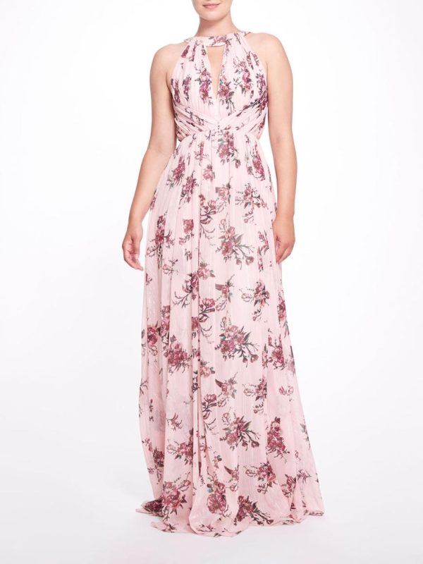 The Carrara gown in blush is a floral paradise. Featuring a printed lurex floral chiffon, a rounded halter neck, an open back, and a key-hole neckline, this dress is as graceful as a doe.