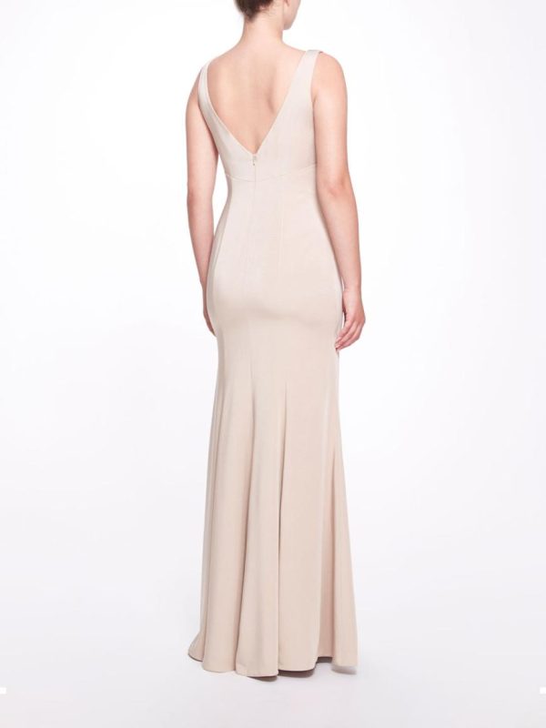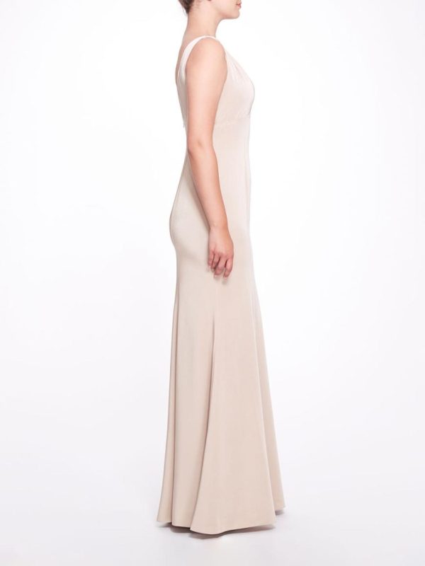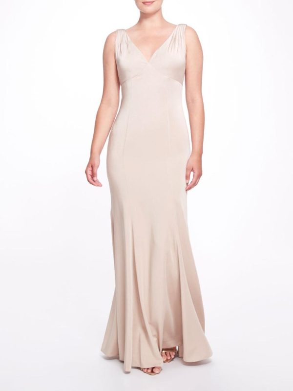 The Forli gown in champagne is elegance personified. Featuring an enchanting v-neck and a high-waisted silhouette with a satin crepe stretch, this dress is romantic and sultry.