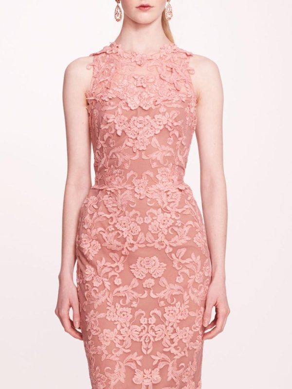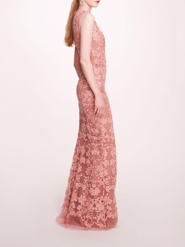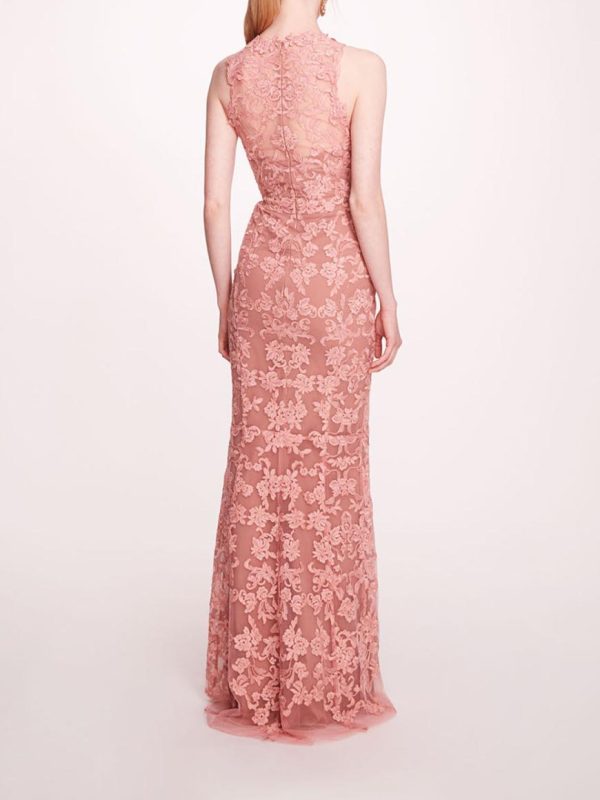 Exude timeless elegance in the Corded Column Gown, crafted from exquisite corded lace and adorned with delicate floral appliqués. This sleeveless silhouette gracefully hugs your figure, creating a stunning profile for any formal occasion.