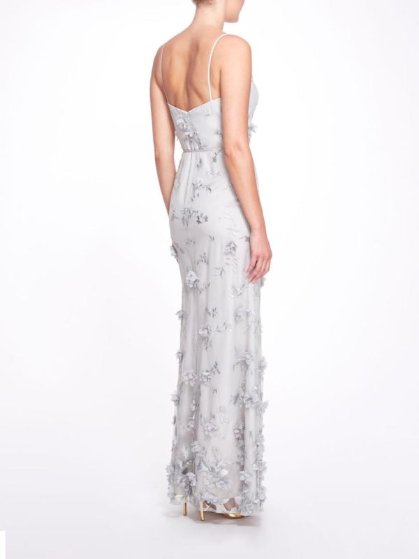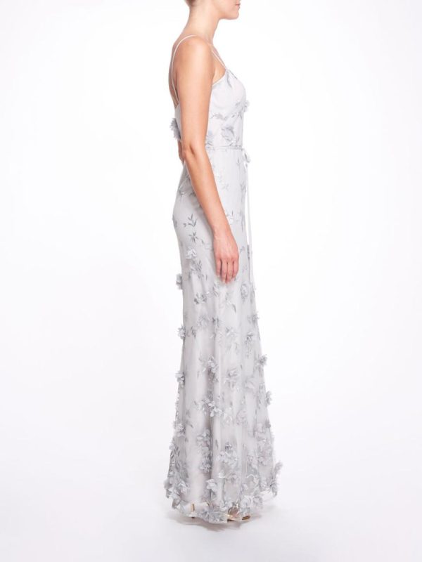 The Savona gown in dove grey is sensual elegance. Featuring a semi-sweetheart neckline that gracefully transforms into thin straps, garden embroidery with 3-D florals, and an elongated waist tie, this dress is eye-catching for your next event.