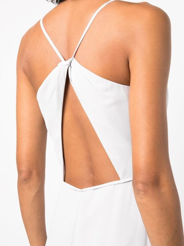The Sessa gown in dove grey blurs the line between geometric and organic shapes. The v-neck drape halter gown features a triangular cutout on the back, single mid thigh leg slit, and finished with an elongated waist tie to give notice to the natural curve of your figure.