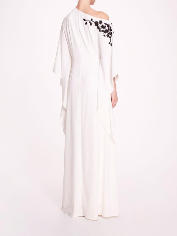 Elevate your wardrobe with the Embroidered Draped Kaftan, a fusion of effortless chic and luxurious detailing. Crafted from fitted stretch crepe, the kaftan features jeweled floral embroidery detailing on the shoulder, adding a touch of opulence to its relaxed silhouette.
