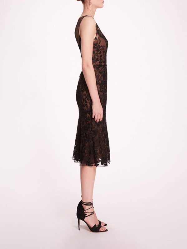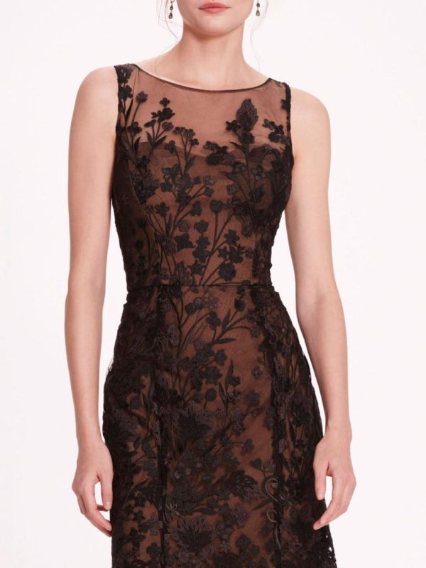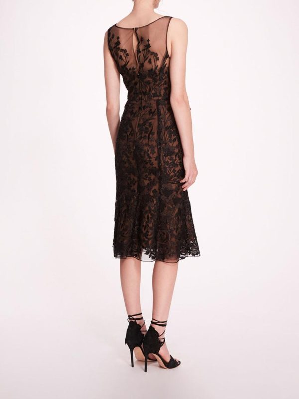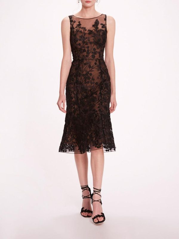 Make a statement in the Embroidered Tulle Midi Dress. Crafted with embroidery on airy tulle, and finished with a flounce skirt detailing, this sleeveless dress effortlessly blends elegance with whimsy, perfect for adding a touch of enchantment to any cocktail or semi-formal event.