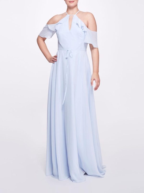 The Ferrara gown is unique and exquisite. In ice blue, this gown features a cold-shoulder chiffon gown, a halter neck, a waist tie, and ruffle sleeves.