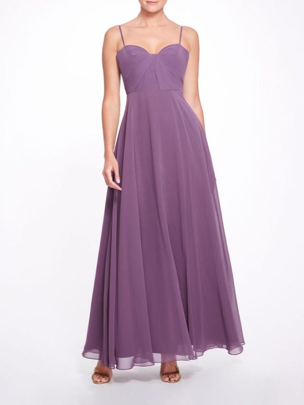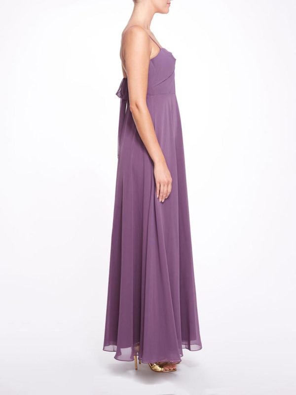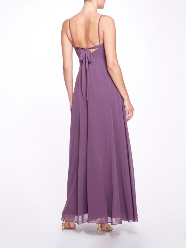 The Verona gown in fig is for the fairytale bridal party. The cami gown features a semi-sweetheart neckline, an open back and is finished with an elongated back tie detail.
